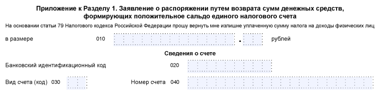 В приложении к разделу 1 находится заявление о возврате излишков уплаченного налога. В нем требуется указать налог к возврату и банковские реквизиты плательщика.