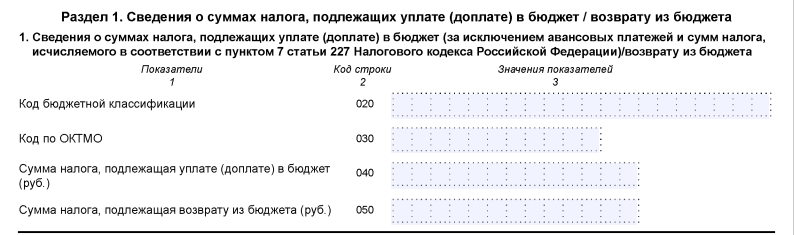 Если у вас налог к уплате (доплате) в бюджет, что применимо к ИП, у которого были доходы (расходы) не от предпринимательской деятельности, то в разделе 1 декларации требуется указать: