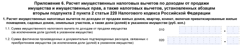 Прочие листы могут заполниться в зависимости от каждого индивидуального случая. Так, например, если плательщик налога получил прибыль от продажи машины, ему потребуется заполнить приложения 1 и 6. Если доход был от продажи квартиры, кроме заполнения ранее упомянутых приложений потребуется также выполнить расчет к приложению 1.