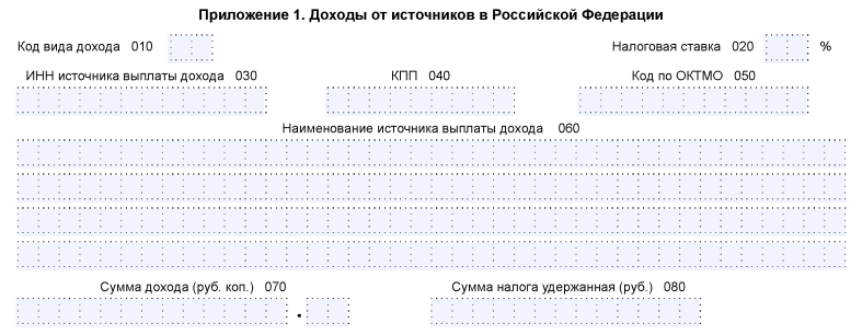 - в строках 010 и 030 требуется указать всю сумму налогооблагаемого дохода (можно взять значение из поля 070 приложения 1);