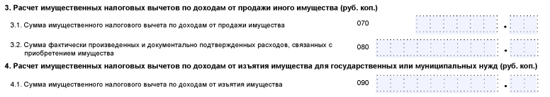 - пп. 3.1 ‒ для оформления имущественного вычета (строка 070). В этом поле потребуется указать вычет по доходу от продажи автомобиля, но в размере не превышающем 250 000 руб.);