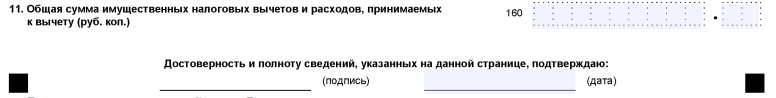 - в строке 040 при необходимости указывается сумма налоговых вычетов. Если вычет за продажу имущества можно взять значение из поля 160 приложения 6. Если вычет требуется только по расходам на уплату процентов по ипотеке, значение можно взять из пп. 2.7 приложения 7 декларации.