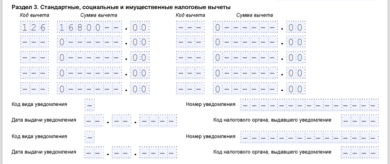 В полях "Код вида уведомления", "Номер уведомления", "Дата выдачи уведомления", "Код налогового органа, выдавшего уведомление" содержится информация об уведомлениях, на основании которых предоставляются вычеты.