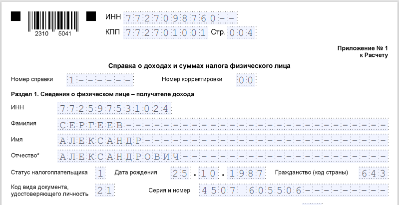 Раздел 1 справки содержит сведения о физическом лице, являющимся получателем дохода: