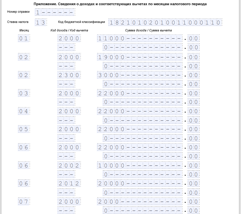 Приложение к справке заполняется по каждому месяцу отдельно для каждого сочетания налоговой ставки и КБК. В строках приложения один за другим указываются полученные физлицом доходы в месяц, а также связанные с ними вычеты (кроме стандартных, социальных и имущественных п. 47 Порядка заполнения расчета 6-НДФЛ).