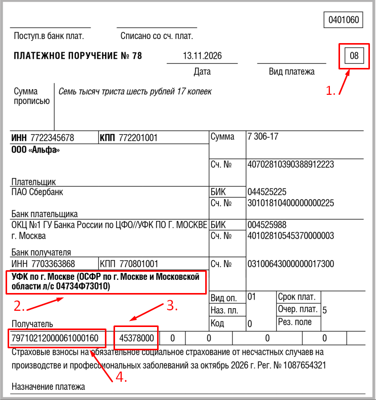 3. ОКТМО — потребуется уточнить в отделении фонда. Обычно это восьмизначный код по месту нахождения отделения, но некоторые ОСФР требуют указывать ОКТМО по месту регистрации организации.